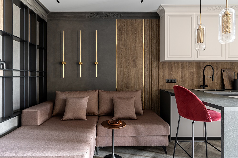 Такой ход сыграл на то, чтобы зона отдыха стала более тёплой и живой. За это здесь отвечает золотая перегородка и фурнитура, тёплая подсветка и кварцевый ламинат Дуб Калифорния на полу.